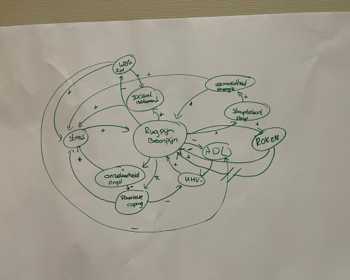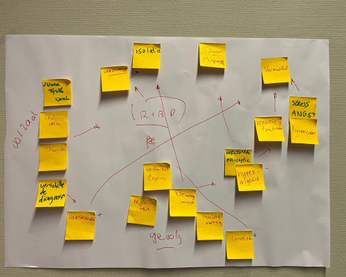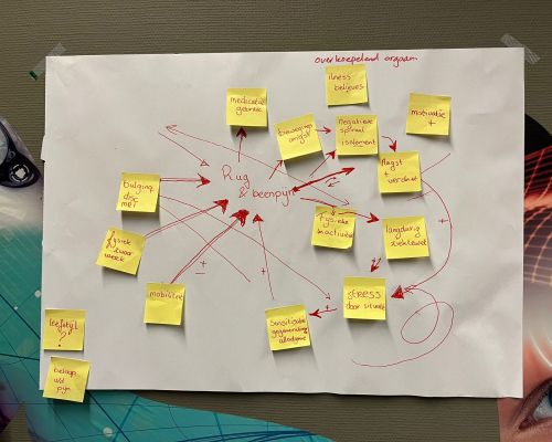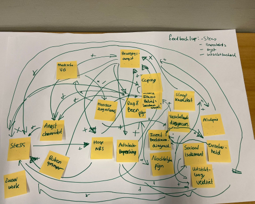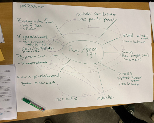 beeld in plaats van een analyse van deelproblemen en dat gelijktijdig zowel oorzaken als gevolgen in kaart gebracht worden. Deelnemers brengen met elkaar vanuit hun verschillende perspectieven de factoren in kaart die samenhangen met het centrale probleem. Hier is het centrale probleem, uiteraard, rugpijn.